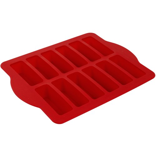This silicone dessert bar pan makes 12 bar-shaped dessert bars. It can be used with brownies, cookies, cake, breadsticks, cornbread and more. The outer steel reinforced rim inside the silicone prevents movement and shifting from baking in the oven. The silicone center in each bar is flexible for easy removal of the baked goods. It is designed with large easy to grip handles and holds 1 box of brownie mix. The pan measures 10-1/2-inch by 13-1/2-inch and is dishwasher safe.